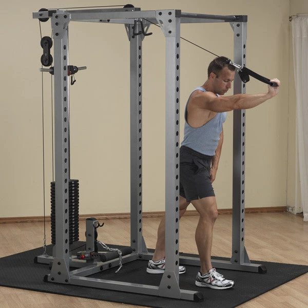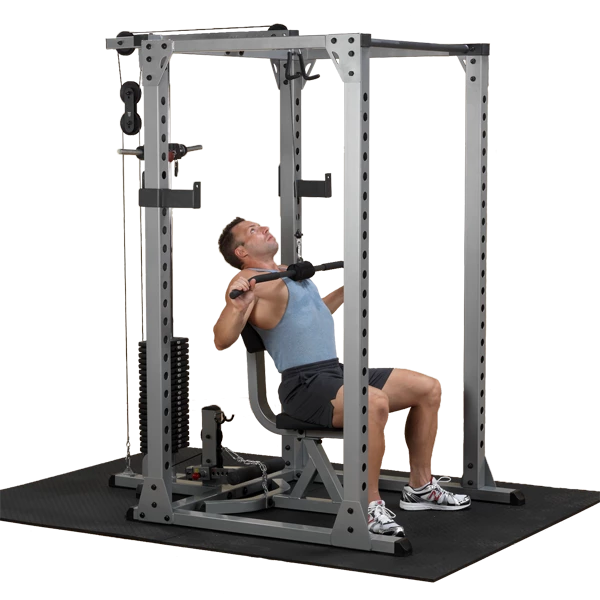 Transform your Body-Solid Power Rack into a multi-workout machine. This Lat Attachment will help you build a wider, beefier Back and/or stronger and bigger Biceps and Triceps. Features nylon coated, aircraft quality (2200 Lb. test) cables. The Plate-Load carriage on this Lat Attachment features 1″ diameter weight posts that will accommodate Standard or Olympic Weight Plates. Includes Lat Bar and Low Row Bar.