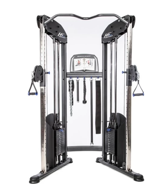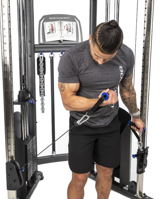 - ACCESSORIES: Dual Contoured Single Handles, Sports Stick, Long Bar, Tricep Rope, Padded Ankle Cuff, Chin/Push-Up Assist Strap, Dual Heavy-Duty 21 Link Adjustment Chain Set, Exercise Book