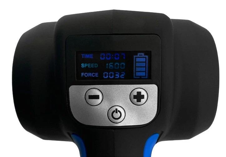 This massage device also features an ergonomic, non-slip grip for easy use, while an LCD-display shows the time elapsed, RPMs, applied force and battery life.